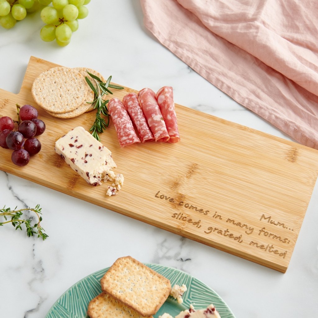 For those looking for a cheesy Mother’s Day or Christmas gift, our bamboo cheeseboard can be layered with cheeses, cured meats and all her favourite foods. Personalise with her name and your own unique message - she'll never get bored of reading your cheese puns! Then prepare all her favourite treats and snacks and present to her alongside a glass of wine and it'll be a present she will certainly enjoy using.