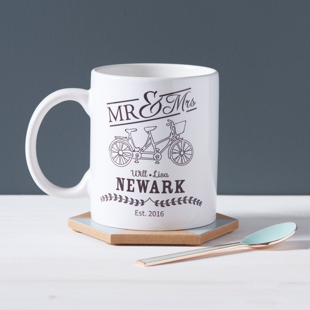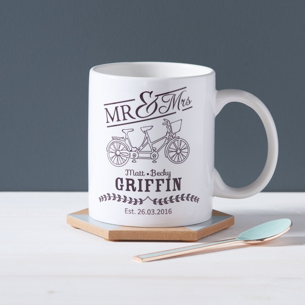 Congratulate your favourite couple for getting engaged or married or surprise your other half on Valentines day or at Christmas with our wonderful Mr & Mrs personalised mug with their surname and the special year. It'll make a unique gift that they will adore, especially if they love to cycle, and they'll get to use every day for their morning coffee or afternoon tea.