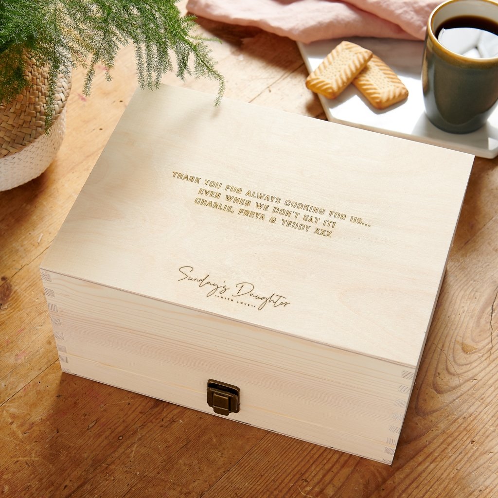 A hand-crafted wooden recipe keepsake box for the head chef of the home. A unique gift idea for Father's Day, his birthday or Christmas to store his favourite cooking creations, baking blueprints, or any other kitchen mementos. Plus, it'll help to keep him more organised as he whips up his own Father's Day family dinner.