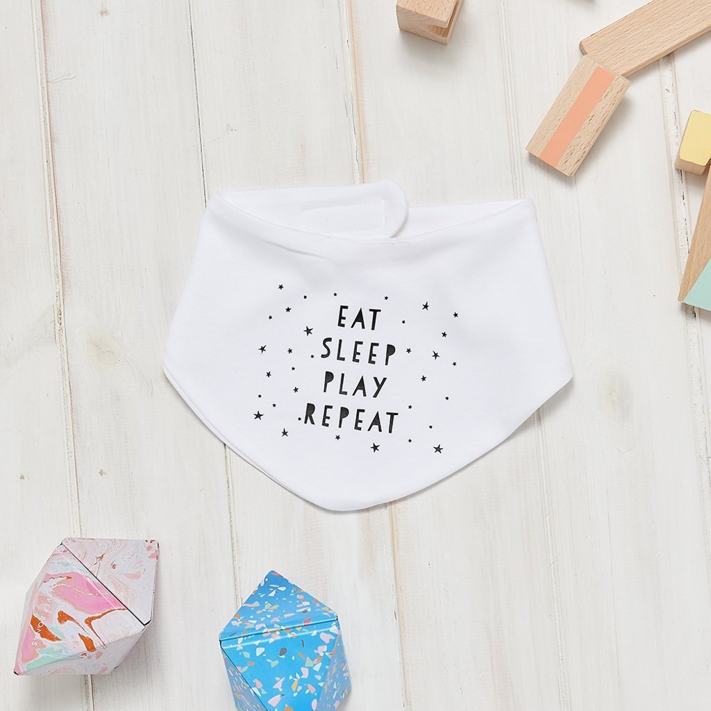 An adorable bib printed with the words Eat, Sleep, Play, Repeat makes a gorgeous present for a new born baby. Made from 100% cotton, making them soft on baby's skin and feature our slogan design. The bib can be printed in a number of colours, making this a truly unique present.