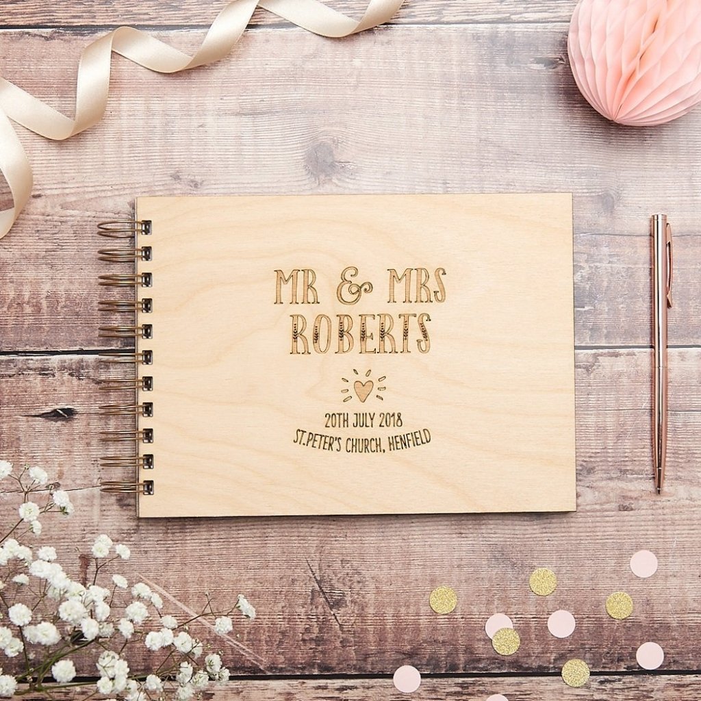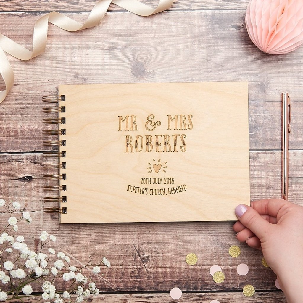 A luxury laser engraved wooden wedding guest book featuring our gorgeous Mr & Mrs Heart design.