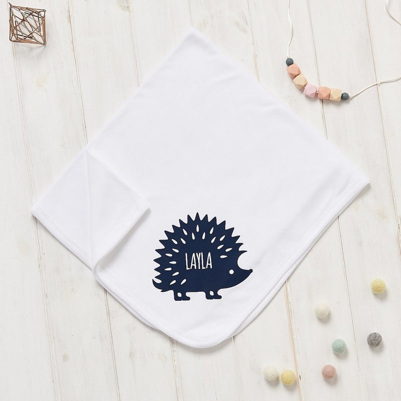 A super-soft and super cute animal design, personalised with a name and perfect for a little baby hedgehog. Made from 100% cotton, making it soft on baby's skin and featuring our animal design! The blanket can be printed in a number of colours, making this a truly unique present that will be cherished for years to come.
