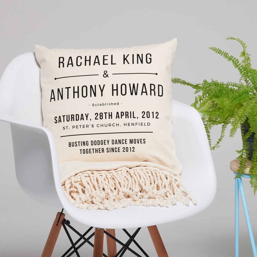 A unique and gorgeous cushion which makes the ideal wedding gift which you can customise to suit the lovely couple. Each cushion is personalised with the couples names, wedding date, church details and message and is made in our Sussex based studio. Our cushion design is a really great personal gift that will be loved as a wedding, anniversary, or Valentines Day present.