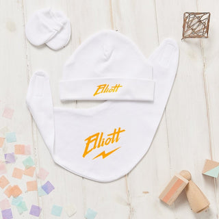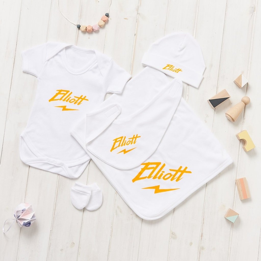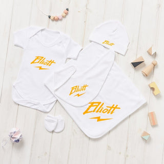 A new baby is always a cause for celebration and our adorable gift set makes the perfect present that the proud parents will adore! The adorable thunderbolt design surrounds the baby’s name, and every part is made from super-soft cotton. This beautiful practical memento arrives in a presentation box, ready for gifting.