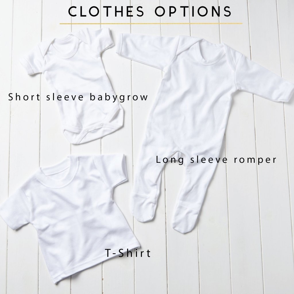- Choose from a long sleeve romper, short sleeve babygrow & a t-shirt.