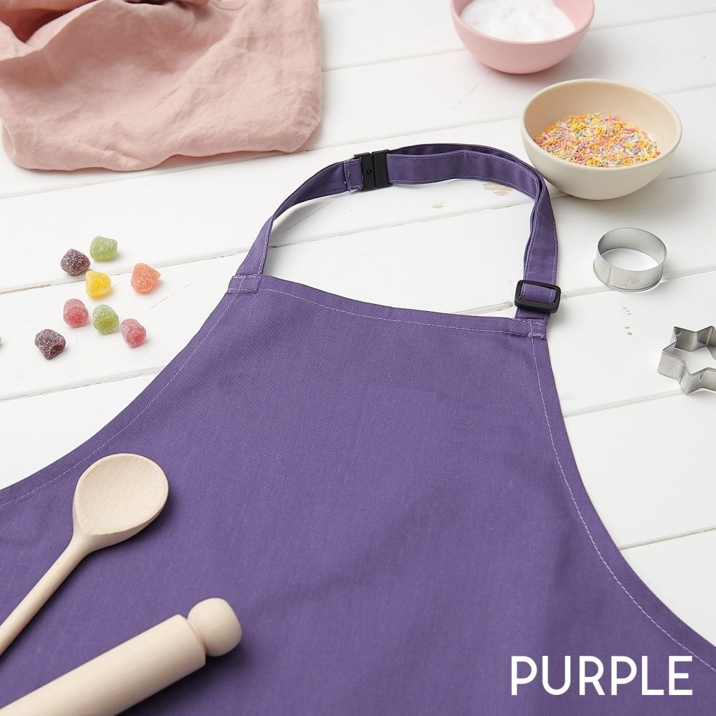 - Children aprons are available in Turquoise, Hot Pink, or Purple. They are also printed with a white design and features back ties with an adjustable neck buckle, but no front pocket.