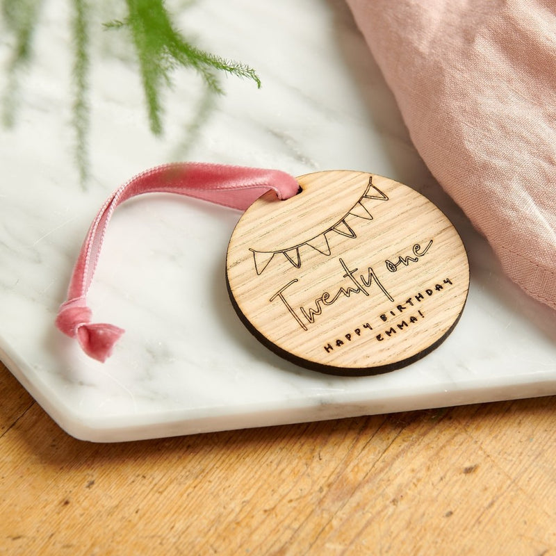 The perfect birthday gift for a very special person, our celebratory discs make a great Sweet 16, 18th birthday or 30th. This example is a great 21st birthday gift, but you can customize your hanging decoration to include any name and age.