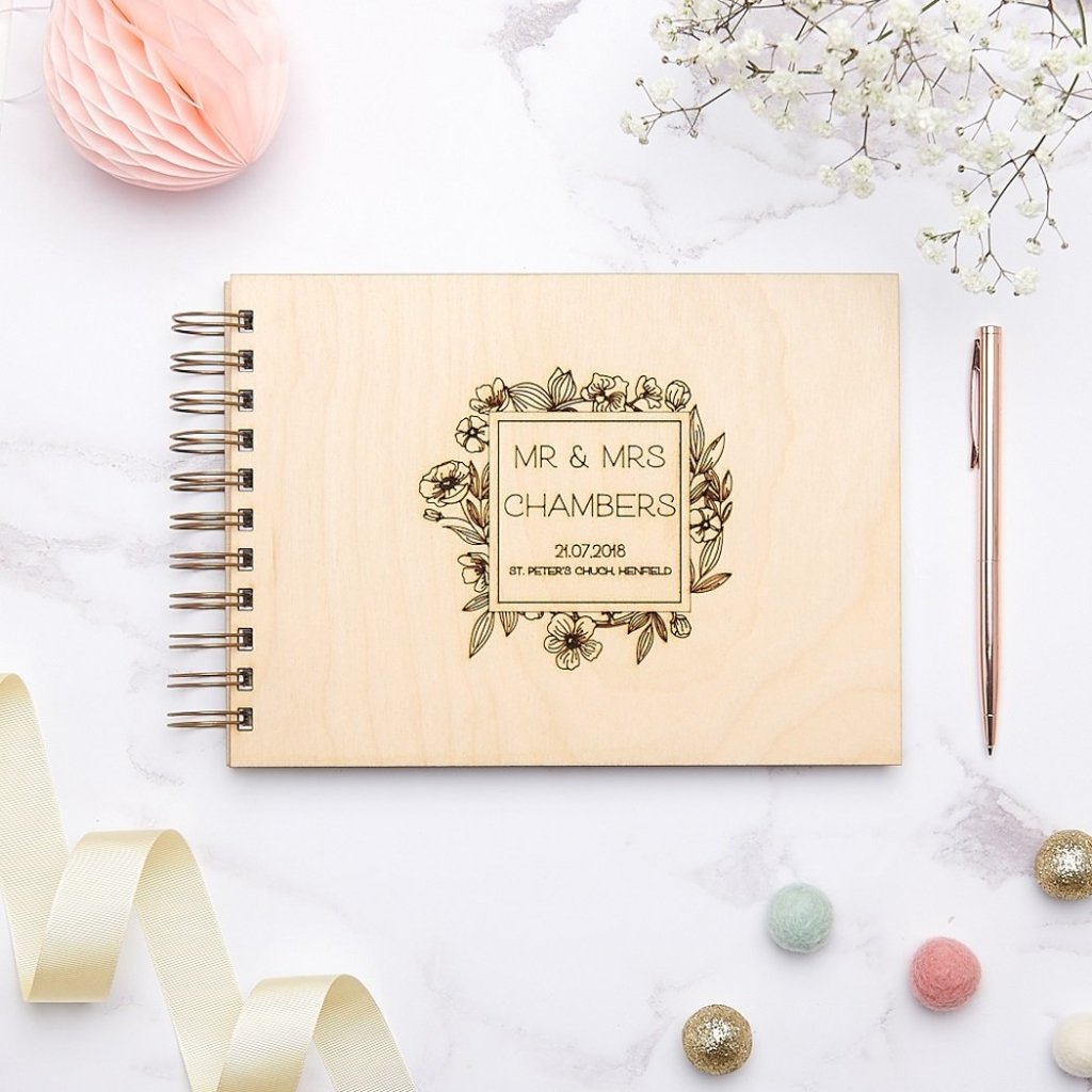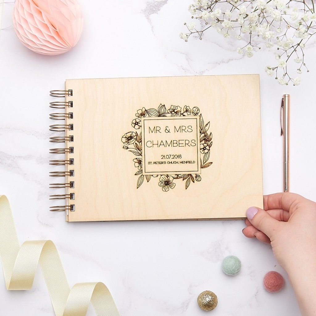 • A luxury laser engraved wooden wedding guest book featuring our gorgeous botanical frame design. This beautiful book is personalised with your surname, wedding location and wedding date. All our guest books can be made from either birch or oak. This is a guest book that can be used on the big day and afterwards can be used as a memory book with wedding snaps, dried flowers from the wedding bouquet and wedding stationery.