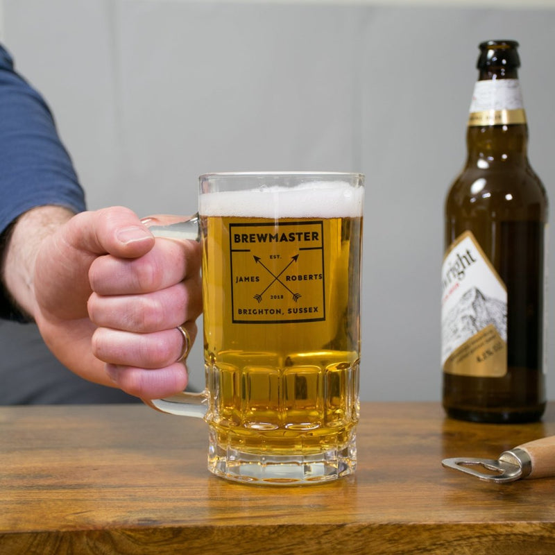 Raise a glass to Dad, and gift him one with this quirky Beer Tankard. A cool Father's Day or Christmas present idea, our high-quality glass tankard can be personalised with their name, home town and year they started brewing on the front of the glass. All that's left is to fill up the glass.