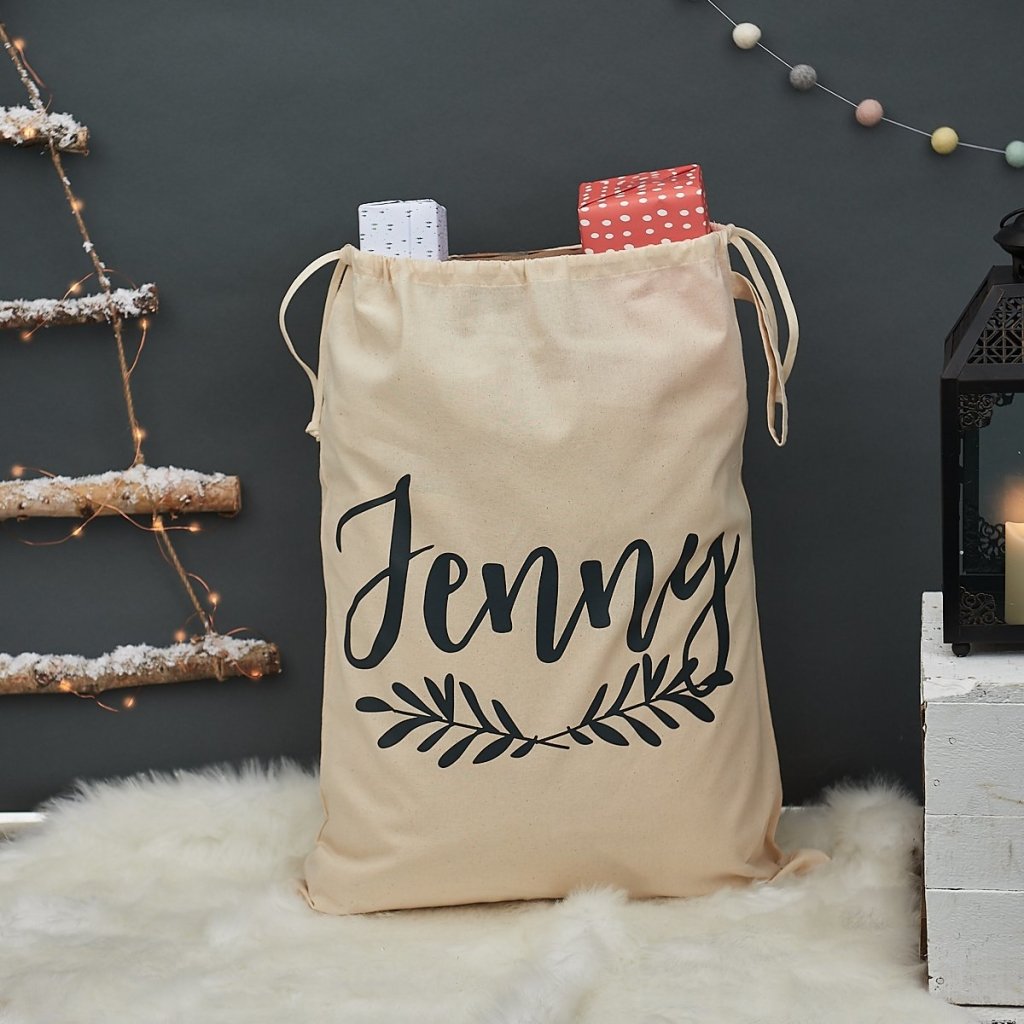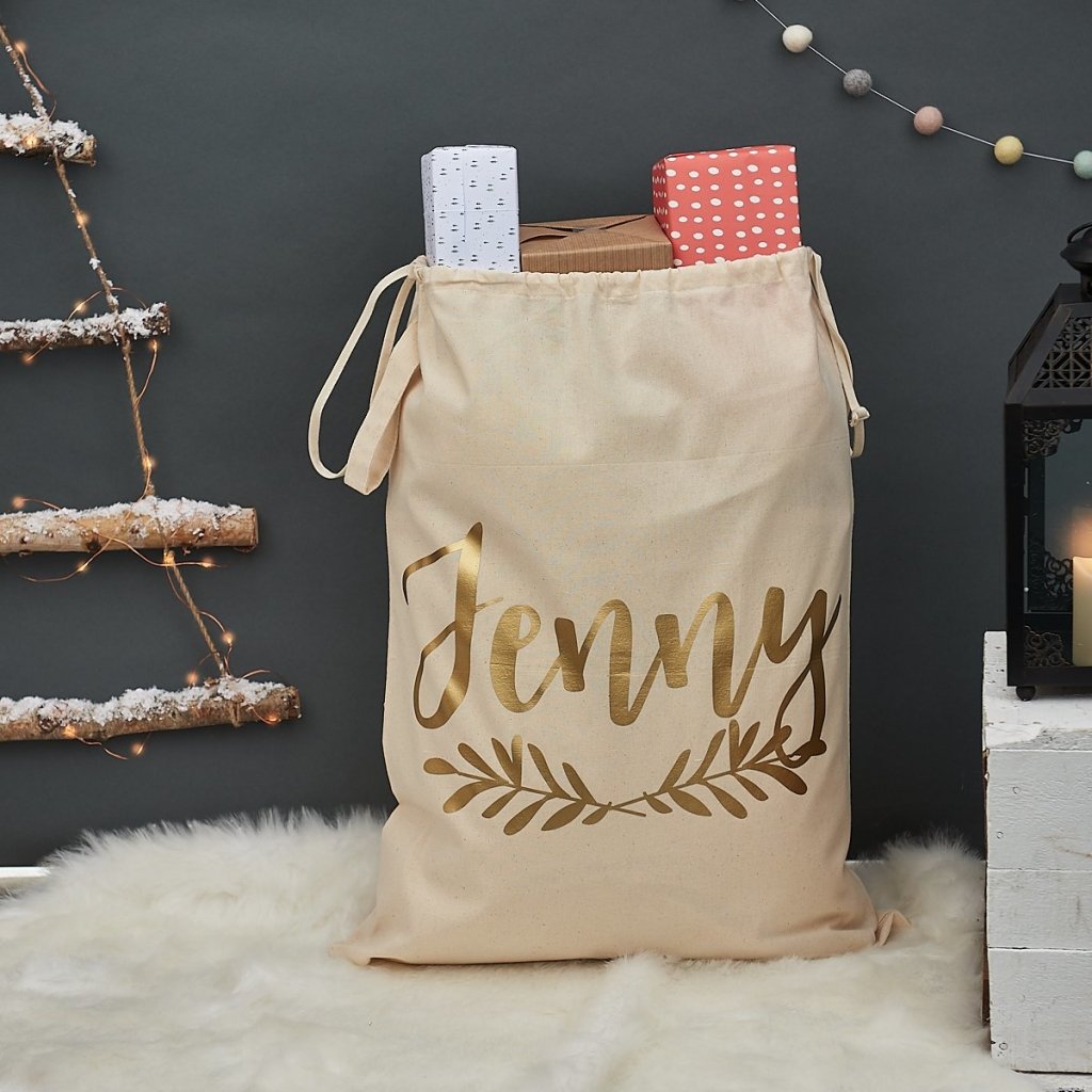 • A lovely modern, personalised laurel Christmas sack that will look fabulous next to the mantel piece or at the end of the bed, ready for Santa! Made from 100% natural cotton, our personalised Christmas sacks are printed in either metallic gold or black. The sack features a hoop so it can be hung up ready for Christmas morning.