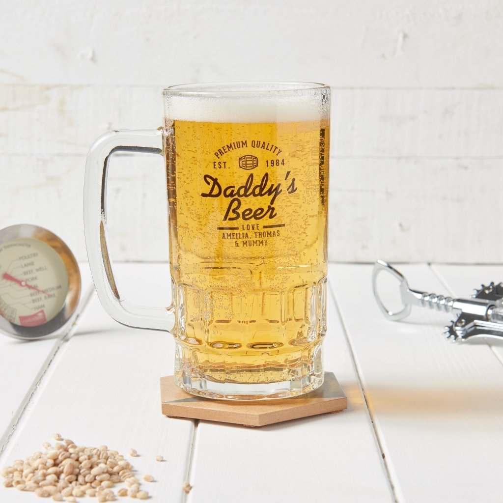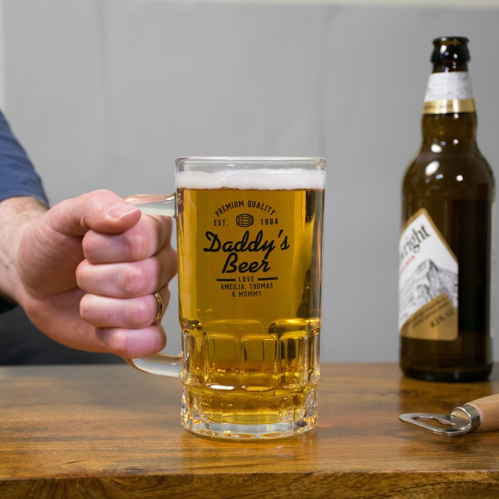 • A cool Father's Day or Christmas present idea, our high-quality glass tankard can be personalised with Dad or Grandad's name, an important date and a personal message underneath. We suggest pairing this gift with a crate of his favourite beers and then all that's left is to fill up the glass and let him relax.