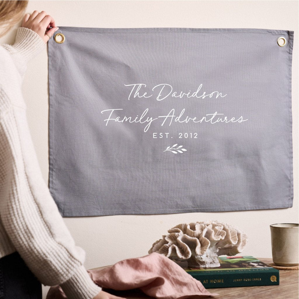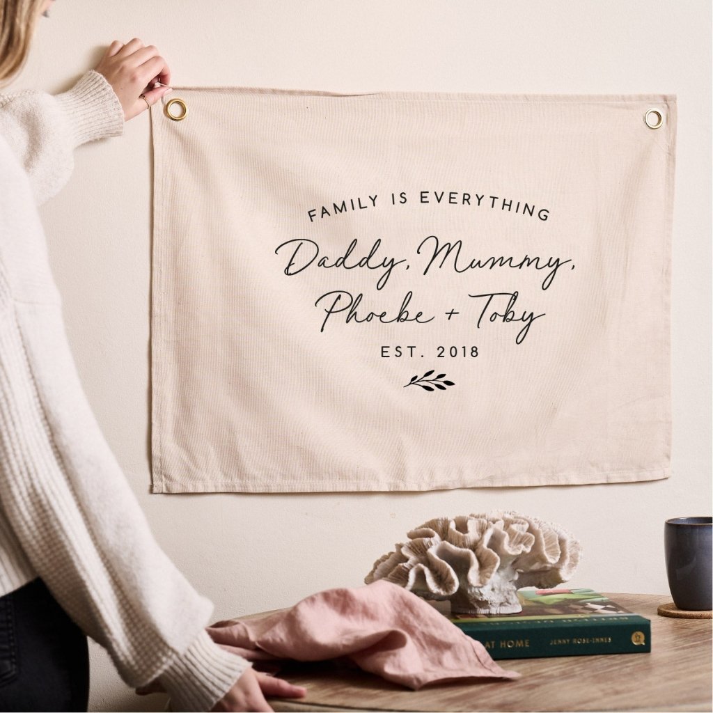 Proudly display this gorgeous linen banner with a sweet message, the members of the family and the special date you became a family. Available in a choice of 2 modern colours that will match any home decor, it's the perfect accessory to add a unique but homely feel to any room. A unique Christmas gift for families or Mother's Day gift for Mum or Grandma, personalise this beautiful wall hanging with the children or grandchildren's names and a heartwarming message so they can show it off at home.