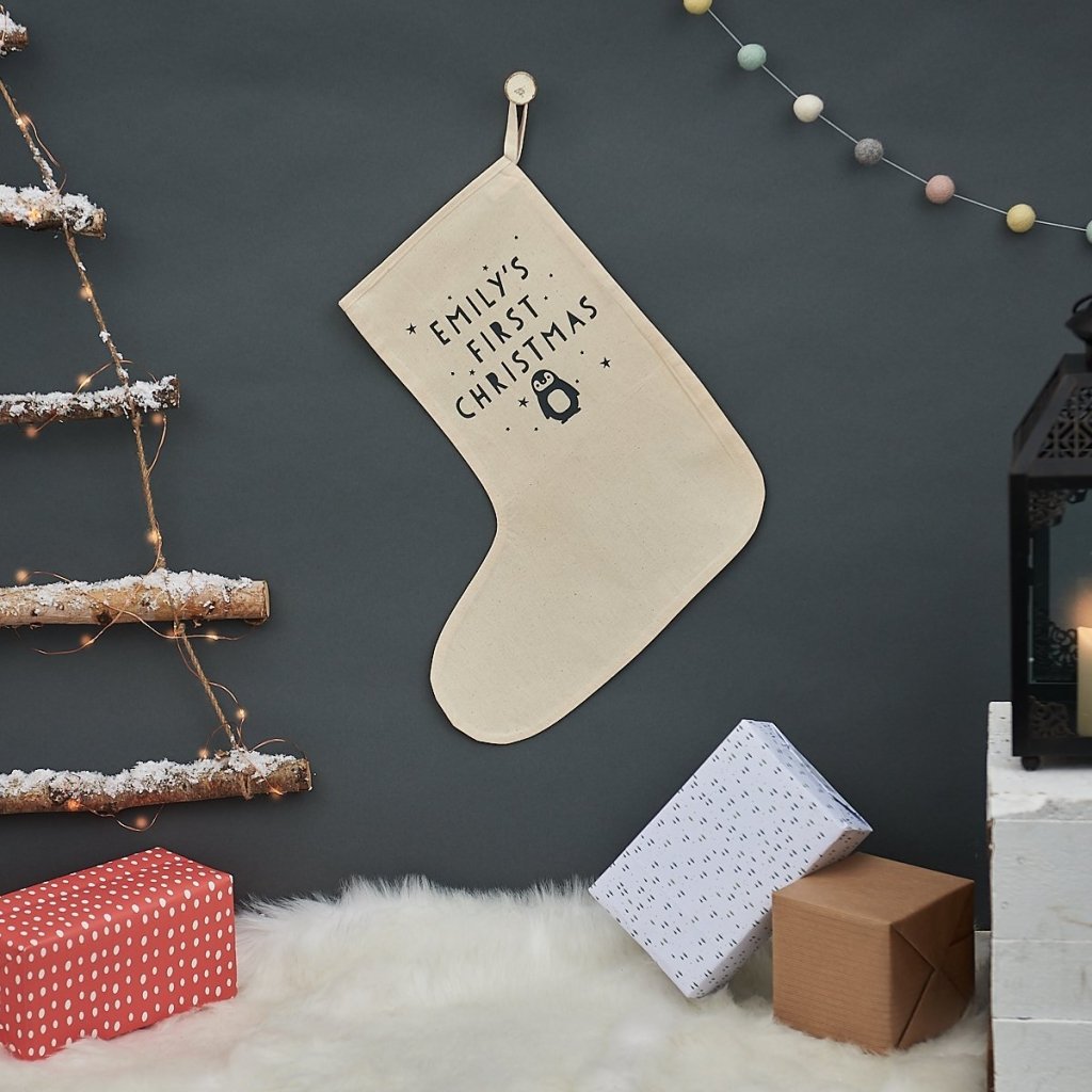 Our festive design is ideal for the special first Christmas and each stocking is large enough to carry a good amount of presents. It can then be stored in a keepsake box after the big day! Made from 100% natural cotton, our personalised Christmas stockings feature a hoop so it can be hung up ready for Christmas morning.