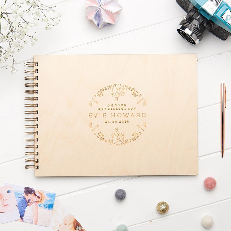 A luxury laser engraved wooden Christening guest book featuring our gorgeous floral design. This beautiful book is personalised with baby's name and Christening date and can be made from either birch or oak. This is a guest book that can be used on the Christening day and afterwards can be used as a memory book with Christening photos and momentos.