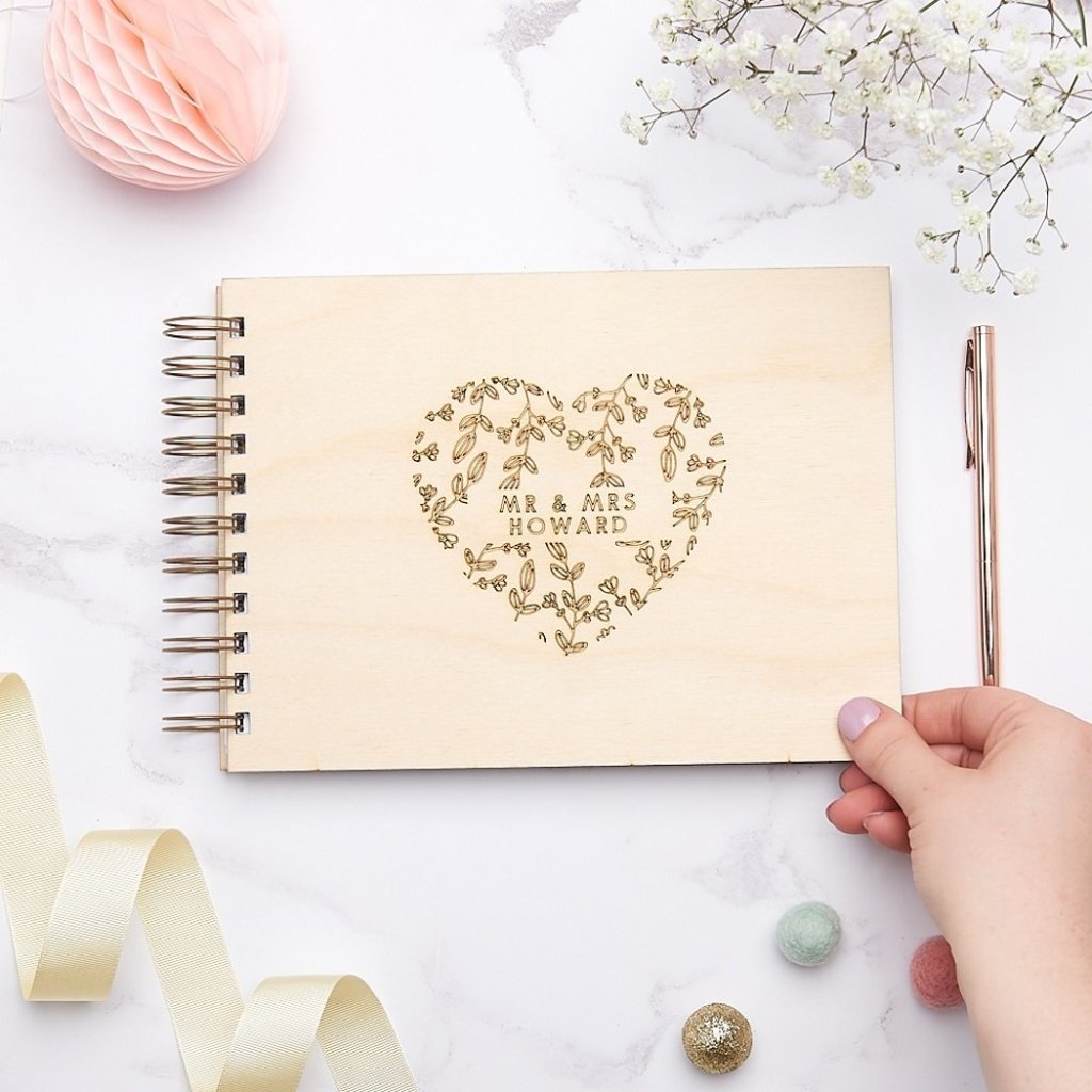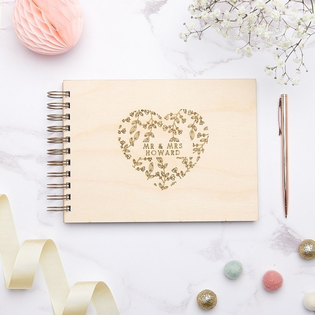 A luxury laser engraved wooden wedding guest book featuring our gorgeous floral heart design. This beautiful book is personalised with your surname or names. All our guest books can be made from either birch or oak. This is a guest book that can be used on the big day and afterwards can be used as a memory book with wedding snaps, dried flowers from the wedding bouquet and wedding stationery.