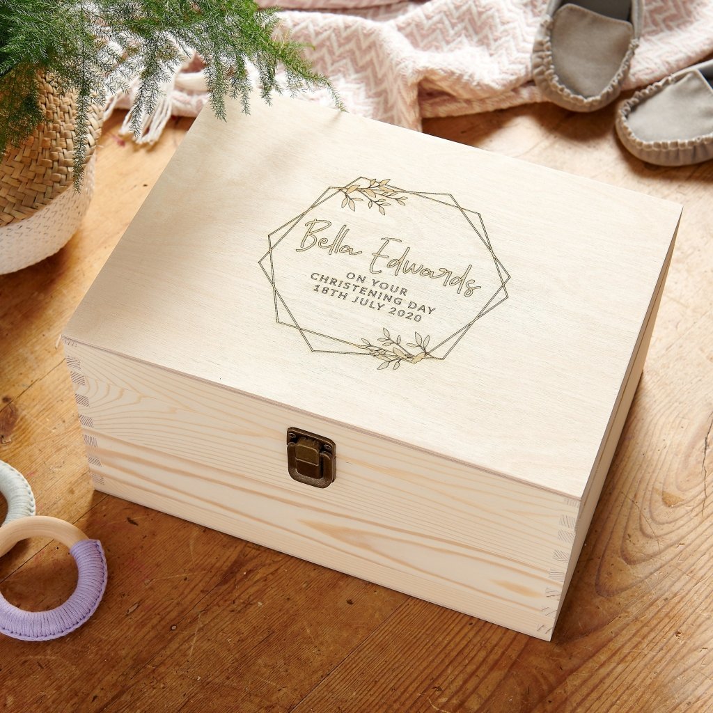 A stunning alternative to the traditional moneybox and photo frames, this wooden keepsake box is the perfect gift for a Christening, Baptism or Naming Day. Made to keep memories close by, this personalised gift for babies and children is a great size & shape to store certificates, candles, photos and any small gifts the proud parents might wish to include.