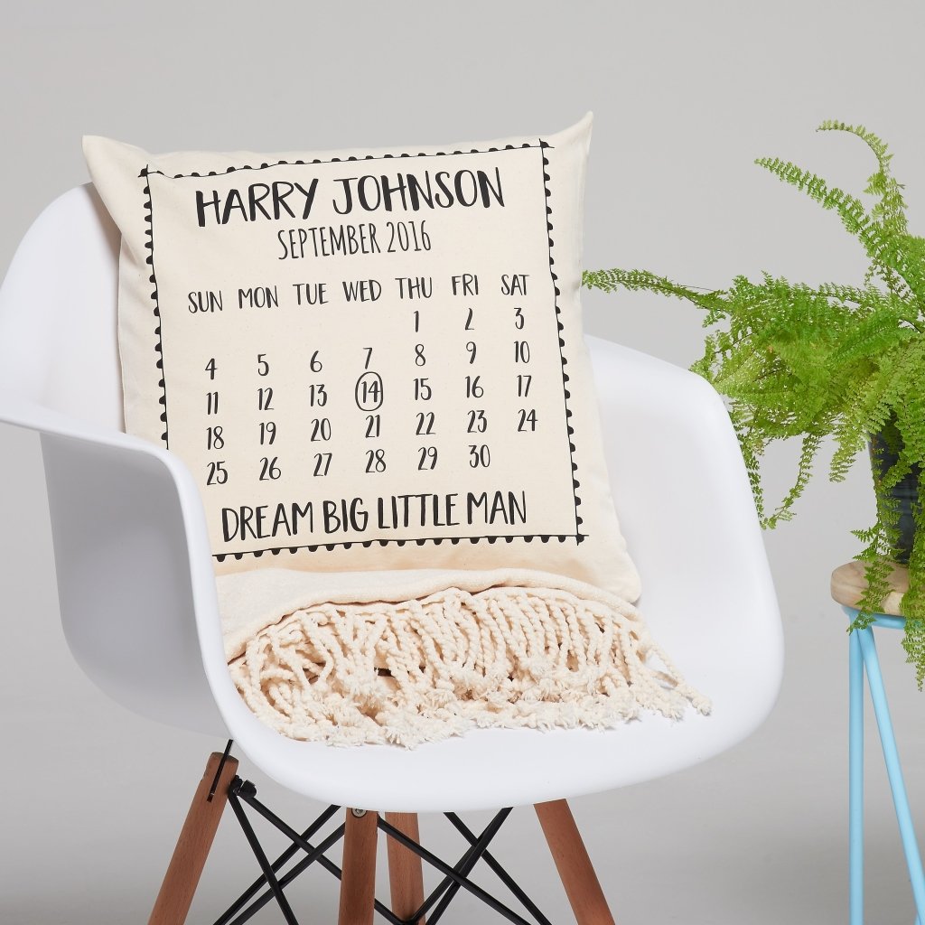 • A unique and gorgeous cushion which makes the ideal new born baby gift to mark the important date. Each cushion is personalised with the name, date of birth and message and is made in our Sussex-countryside based studio. We will personalise each cushion with the month of the date of birth, complete with the day and we will circle the appropriate date.