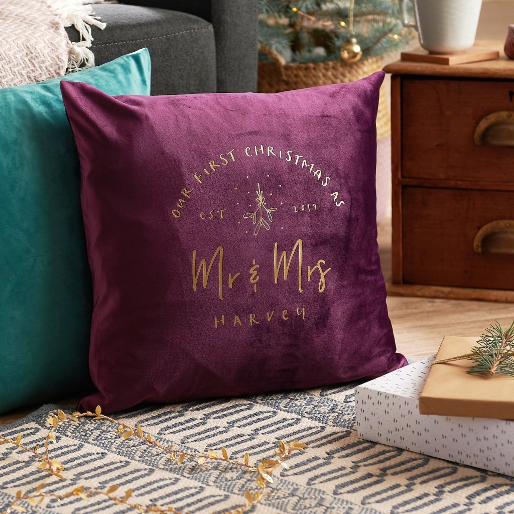 Celebrate your first Christmas as a married couple with our gorgeous personalised velvet Christmas cushion. Whether you are buying for your own home or as a gift for a loved one, this is a great cushion that adds a touch of style and luxury to the home.