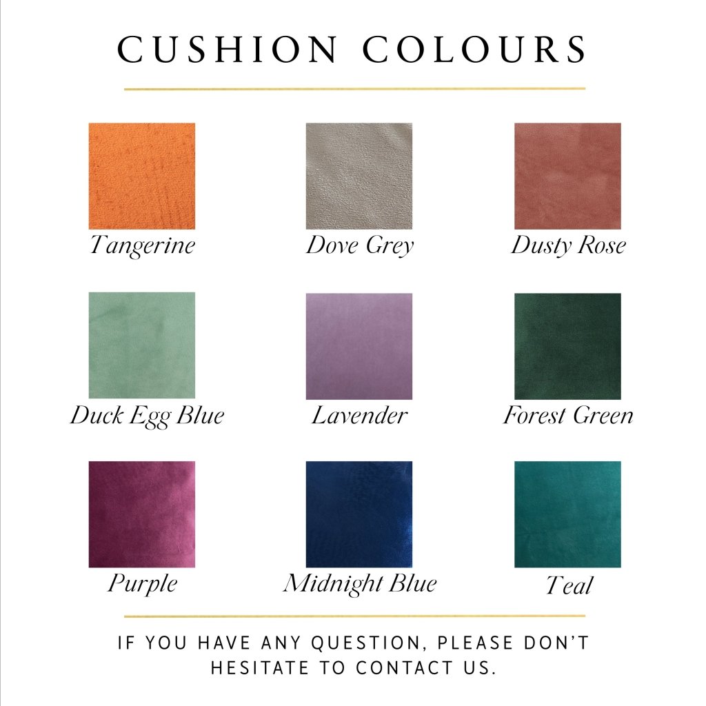 - Our cushions come in nine colours; Tangerine, Dove Grey, Dusty Rose, Duck Egg Blue, Lavender, Forest Green, Purple, Midnight Blue & Teal.