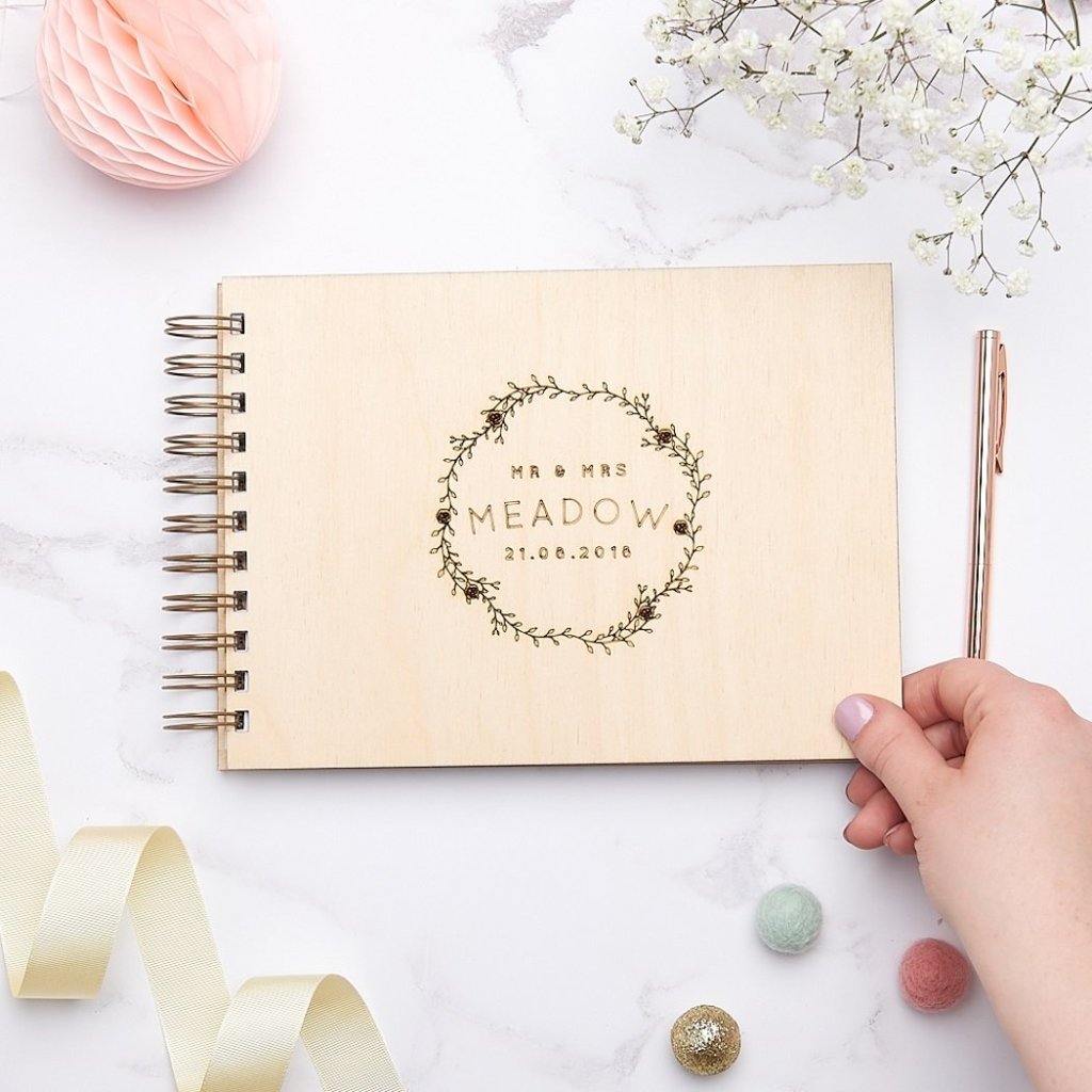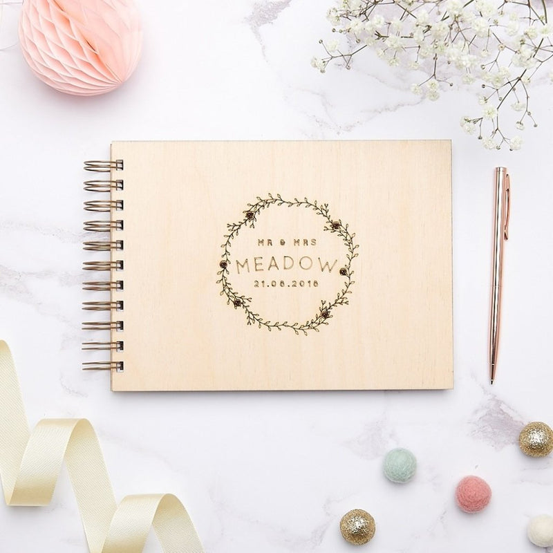 A luxury laser engraved wooden wedding guest book featuring our delicate rose wreath design. This beautiful book is personalised with your names or surname and wedding date. All our guest books can be made from either birch or oak. This is a guest book that can be used on the big day and afterwards can be used as a memory book with wedding snaps, dried flowers from the wedding bouquet and wedding stationery.