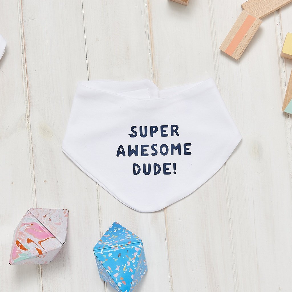 An adorable baby bib printed with our Super Awesome Dude design, makes a gorgeous present for a new born baby. Made from 100% cotton, making them soft on baby's skin and the bib can be printed in a number of colours, making this a truly unique baby shower or new born baby present.